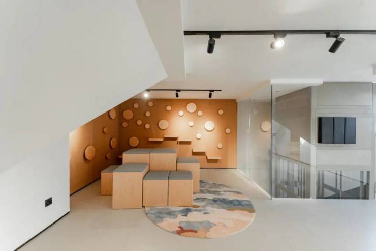 此外,地下室挑高空间同样亮点十足,即使包含夹层也毫无局促之感。在这里,业主可邀请三五好友聚会畅谈,舒适的环境让人几乎忘却身处地下空间,充分展现出名爵府「江山」对空间的极致利用与创新设计理念。