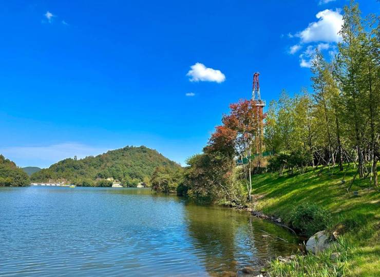 建筑设计:整体建筑立面以现代主义风格为主,建筑形体简洁、大气,以暖色调为主,辅以大面积落地玻璃和干挂石材,外立面时尚美观,与自然环境完美融合。建筑群依山迎湖自由布局,规避了建筑同质化问题。