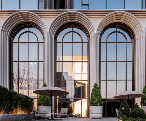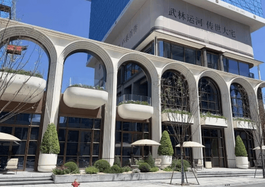 由九米设计操刀,融合意式美学与斯卡帕叠级手法,外立面采用铝板、石材、玻璃与金属线条,标志性近12米通高石材拱券(共26个),形成独特序列感。
