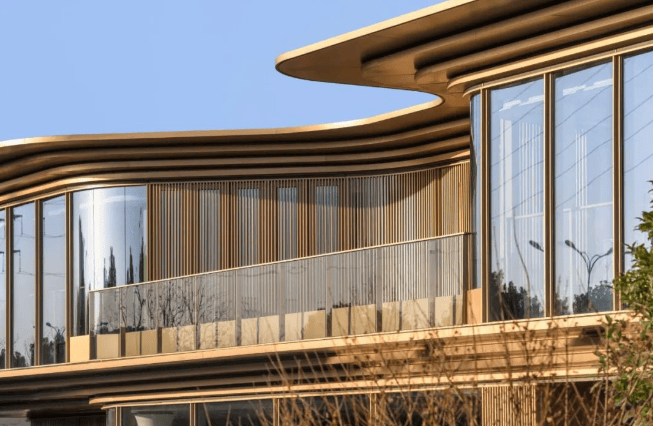 立面风格:采用定制的曲面铝板搭配超常规尺度巨幕玻璃,打造流线形态,提升了城市封面的审美标准,其制作工艺和安装细节都比国标更为严苛。