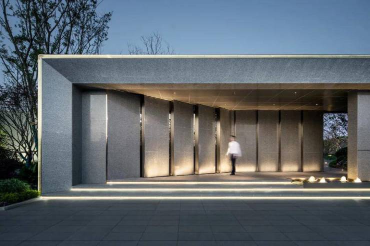 入口横向延展面设计从动态的夏溪河水纹中提炼意形与光影元素,融入到建筑的一体化设计中,大有“言入夏溪曲,光影转庭柯”的朗阔雅境,大气开阔又不失婉转潋滟。在地文化与现代审美相互渗透的秘境溪居跃然呈现于门庭,铺陈开崇高而永恒的流水情怀,隔绝喧嚣,启幕自然。