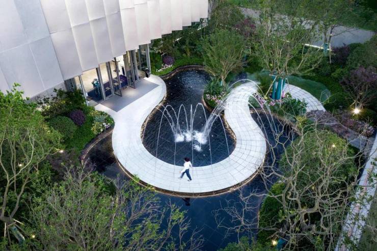 步入这方静谧流动的庭院,能感受到夏溪潺潺,百折迂回的“探幽”乐趣,空间中抓取夏溪河、钱资湖的光影形态,幽潭意象,形成联动的意境空间,布局运用在景观打造中,以曲线美学艺术诠释场地文化精神,灵动水景经由石阶周折引入,曲径纵深,漫步此间,观境由心,归逸溪居,呈现一场“溪绕礼遇,一浸碧空,自然天成”的流动盛宴。