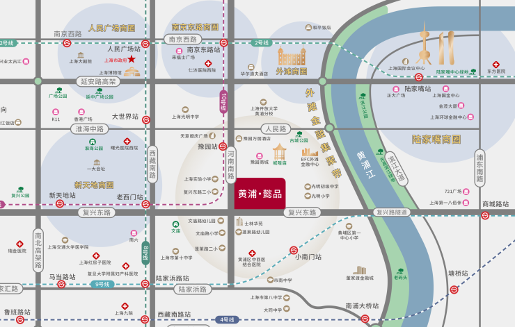 驾车:延安路高架、延安路隧道、人民路隧道,距离复兴东路隧道、内环高架和南浦大桥等较近,主干道有延安东路、人民路、复兴东路和河南南路等,交通非常便利。
