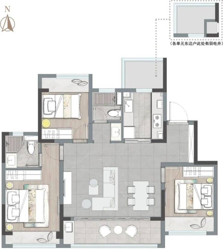 面积段:97㎡(3室2厅2卫)、114㎡(3室2厅2卫)