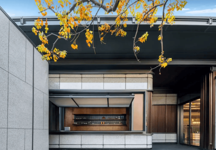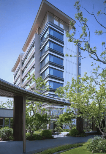 外立面:新中式现代风格,铝板 + 玻璃幕墙,社区含中式园林与主题架空层