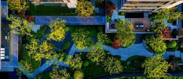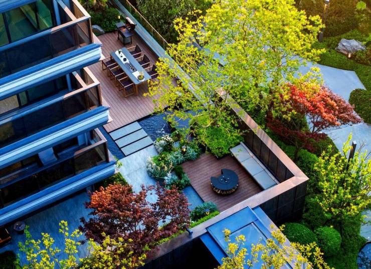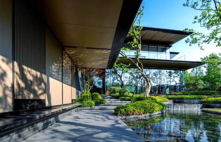 建筑设计:采用台地式建筑布局,实现户户观山景。建筑立面采用宋冠翅帽檐、玉带铝板腰线、全景落地窗,呈现宋风极简风格,重现东方审美意蕴。