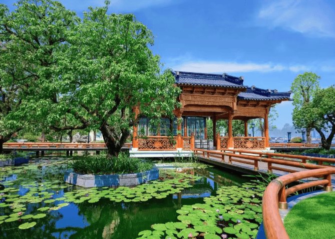 造园技法:承袭香山帮造园技法,融入国粹榫卯工艺,精心筑造六角凉亭和茶轩等,呈现浓郁中式经典园林风格。园林中亭廊轩运用榫卯工艺构建,精致程度令人惊叹。