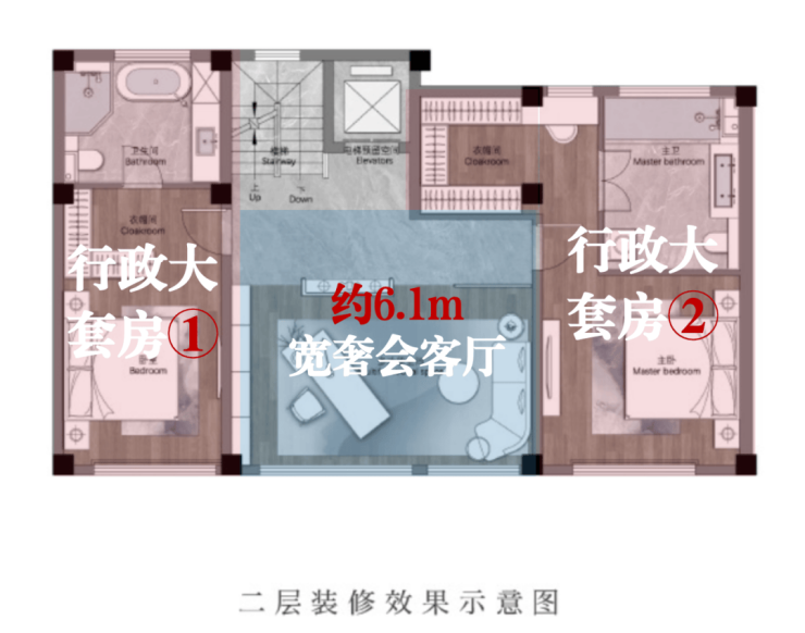 豪华总统主卧套房设计,步入式衣帽间+卫浴豪华5件套,独立的生活系统,在“小家化”主卧实现复合功能生活场景。