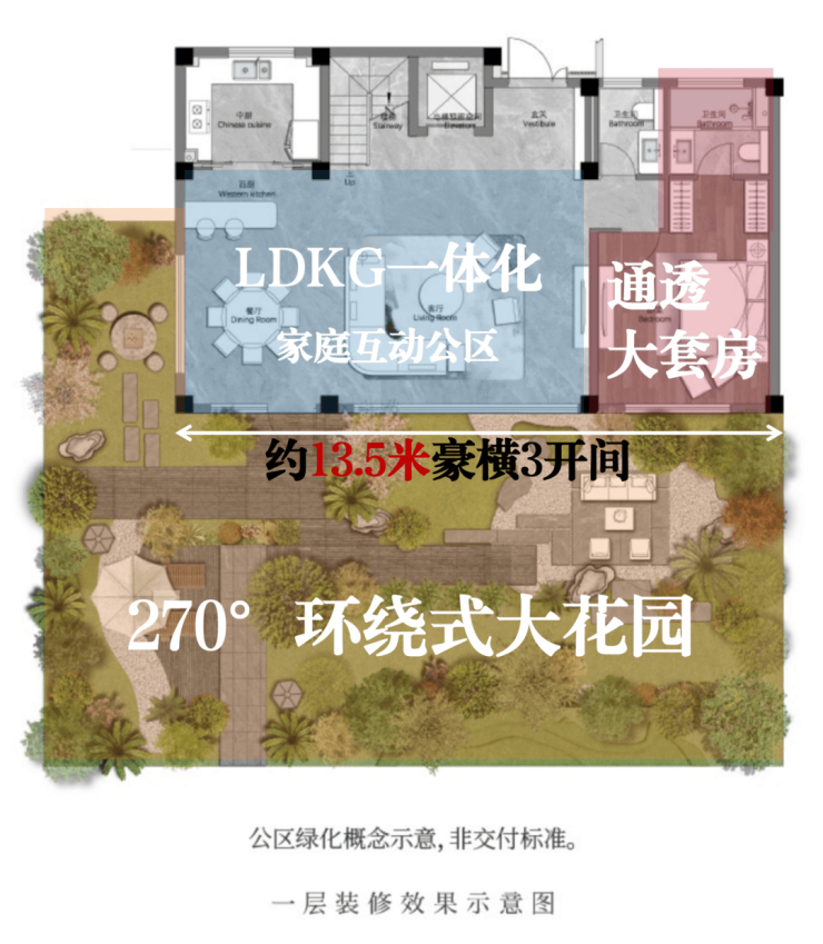 拥有约13.5m超大面宽,是普通别墅产品的1.5-2倍,约50㎡LDKG一体化无界超级大宽厅,气场全开,在保证空间的阔绰之余,客厅、卧室每个空间都能一览庭院全景。