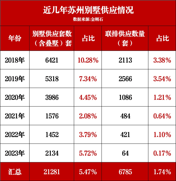 房观统计过数据,近期苏州新房的数据,别墅(含叠墅)一路减少,最近4年占比不足5%,而联排更少,去年不足0.2%,大独栋只能在二手房去淘。