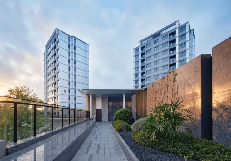 产品亮点:公建化外立面(金属一体板 + 铝板线条),阳台统一封包交付,得房率82%–93%(洋房更高)。