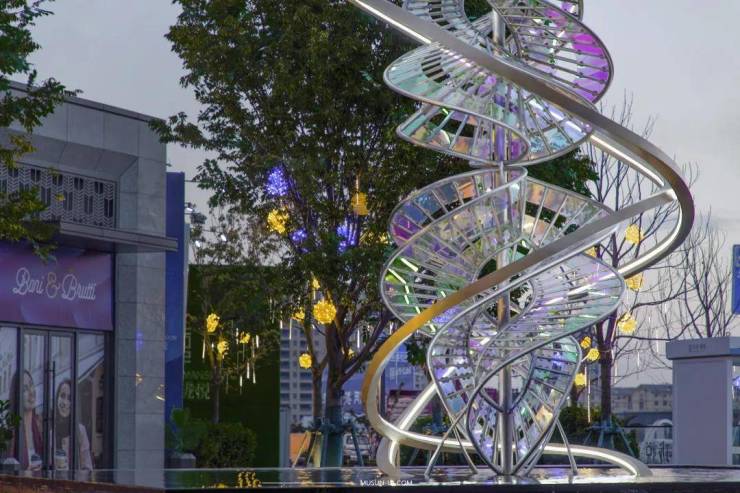 雕塑提取浪花元素,捕捉海浪的运动和力量状态,并将其静态化,展示了灵动的浪花形态,以及浪花在光线下呈现的渐变色彩,完美展现了海洋之美。