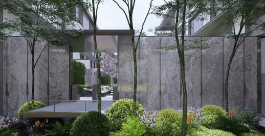 建筑风格:现代中式风格建筑立面,线条简约、质朴,注重流线性,有中式风格点缀。外立面 1-2 层选用干挂石材、铝板线条,顶部有灰色坡屋顶设计,搭配统一的公建化玻璃窗,美观典雅。