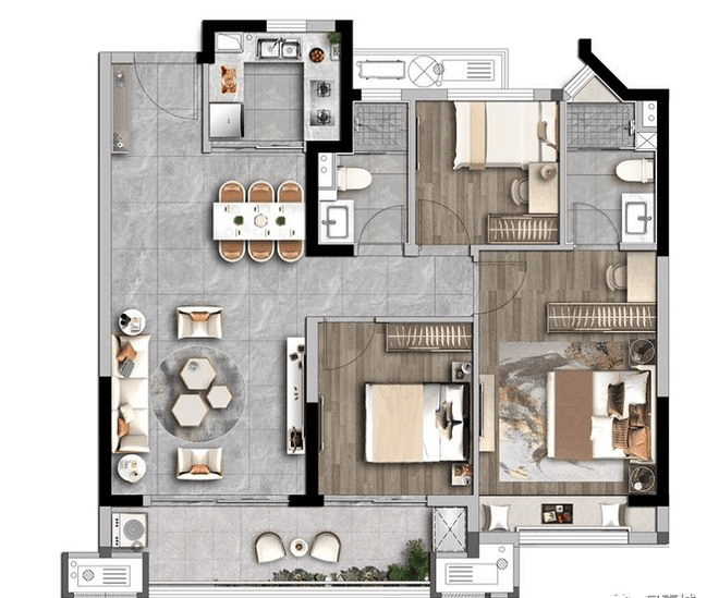 这是一款稍一琢磨,就能发现很多惊喜点的户型。比如连通南北的主卧+超大转角飘窗,比如三个房间最小面宽也达到了约2.95米的尺度,用作卧室丝毫不会拥挤等等。