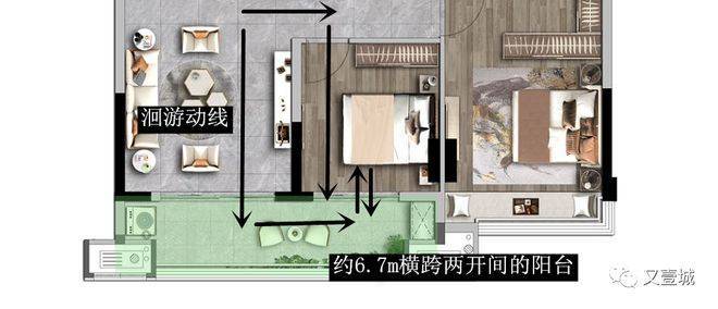 两开间阳台的好处我们提到多次,大采光面+洄游动线,实现生活和休憩阳台的不同出入口,次卧连通阳台,极大地保证了主卧的居住属性。