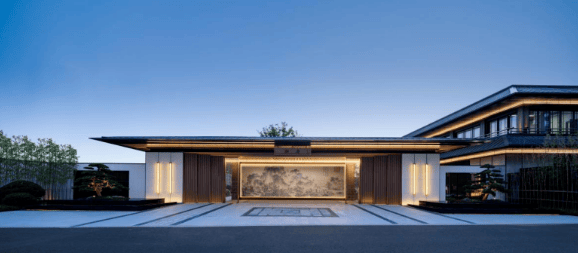 建筑设计:现代风格与宋式美学相结合,运用简洁设计线条、大面积玻璃幕墙勾勒出宁静而大气的建筑美感。别墅立面采用浅灰色玻璃、香槟色金属格栅、铝板、干挂石材与顶部的深灰色瓦片相结合,沉稳大气。