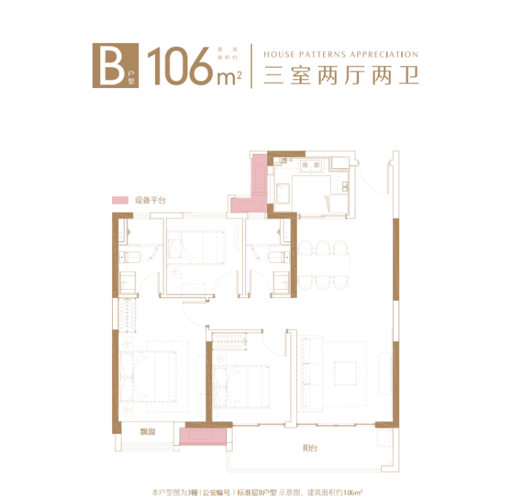 本项目备案名:璟禧云庭(北区住宅),璟禧生活广场(南区整个地块含住宅),璟禧商务中心(北区超高层+办公+沿街商业),开发商:苏州骏恒房地产开发有限公司;本户型图为3幢楼(公安编号)标准层B户型图,建筑面积约106㎡,建筑面积为估算,相同户型单位因楼栋、楼层、单元等差别,局部结构、细部尺寸,面积等可能不同;户型图中的装修装饰、家居布置、空间布局等仅为示意,不作为实际交付标准或合同样品;本资料仅为要约邀请,不构成出卖人的要约或承诺,买卖双方的权利义务以双方签订的《商品房买卖合同》及其补充协议为准;相关宣传内容不排除因政府相关规划、规定及出卖人分期规划、未能控制等原因而发生变化,如有修改、调整恕不另行通知,敬请留意最新宣传资料。