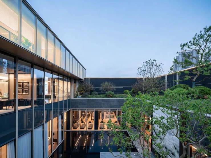 下沉庭院设计了⼤⾯积景观⽔⾯,寓意「引江⼊园」,并以纯粹⼲净的玻璃幕墙与爱尔兰绿奢⽯墙对景,营造出静谧、沉稳、祥和与空灵的氛围,希冀抚平闹市的喧嚣,实现「出则繁华、⼊则静谧」的生活场景。