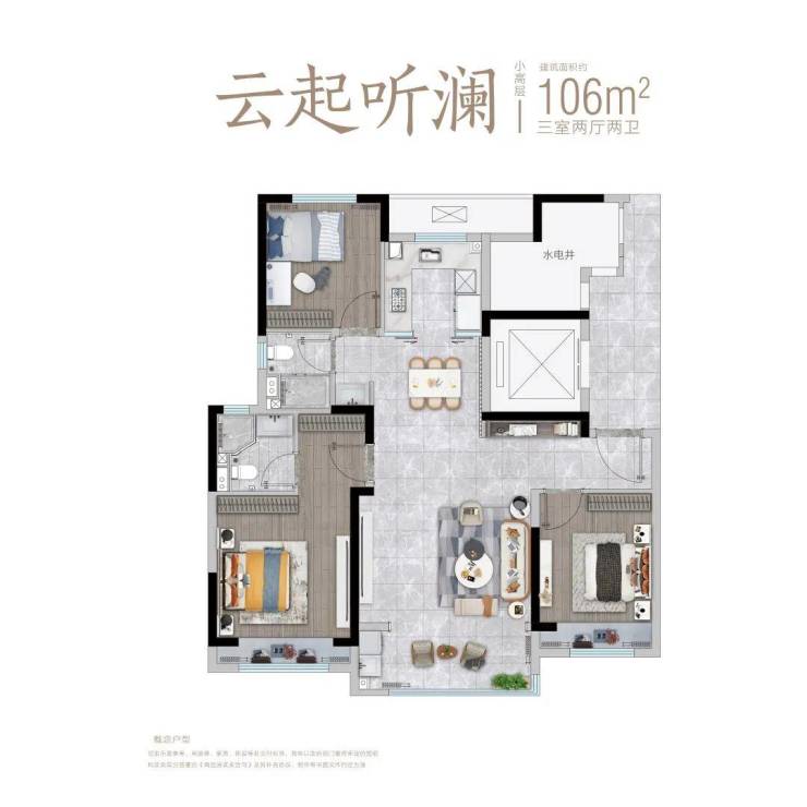 建面约106㎡户型,双卫生间,能满足两孩家庭、三代同堂的起居需求。约4.2m横厅,扩大了室内的采光面。