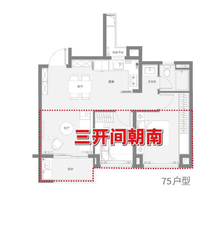 建面约75㎡2房,总价231万起,做到罕见三开间朝南,其中双卧均朝南。