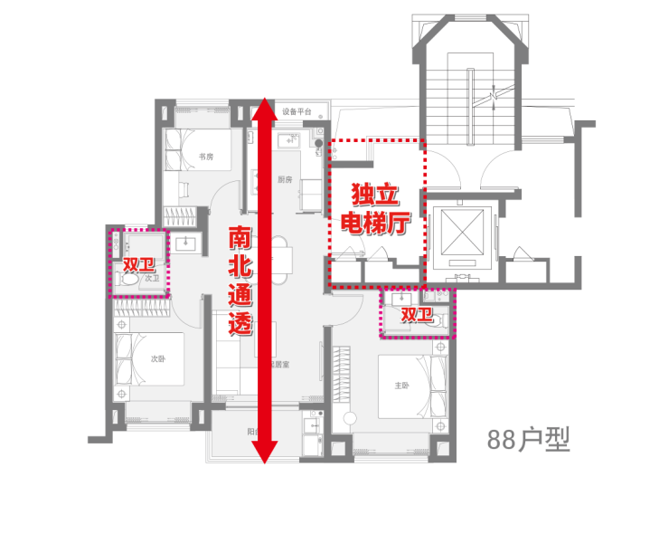 具体而言,建面约88㎡比同级户型多了“1卫”,免去家庭抢厕所的烦恼,大大提升居住体验,未来在二手房市场也更具竞争力。