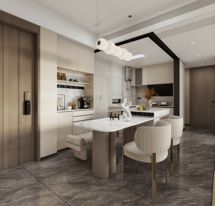 客餐厨一体化,既减少了过道的浪费;又打破了传统布局中的“隔阂”,几个功能区独立又互通,将空间功能进一步放大。
