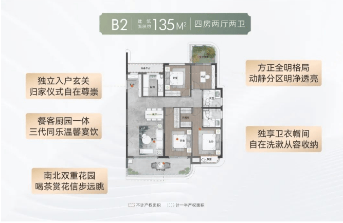 其中,建面约110㎡户型三房两厅两卫,高定奢适主卧,四开间朝南,厅堂衔接空中花园,森氧无界。建面约135㎡户型一步到位升级之选,四房格局陪伴家庭成长,南北两大花园双境瞰景,生活自然惬意。双户型仅最后一幢,收官封藏机遇不可错过。