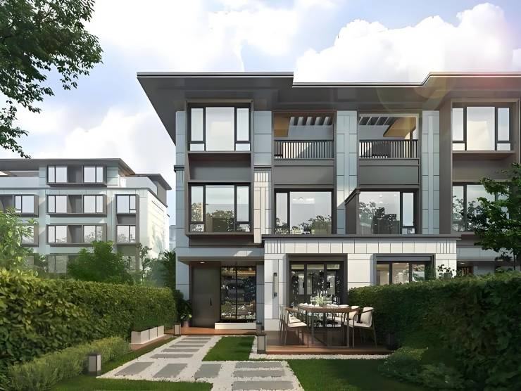 主力户型为建面约 92㎡的联排别墅,总层高约 12 米(不含地下室),实际使用面积约 200㎡,可自由分割、灵活组合。每栋别墅均带有前庭后院,为业主提供私密的休闲空间。