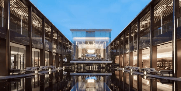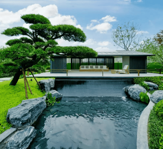 宋风园林设计:以宋代美学为蓝本,打造了立体山水园林,融入《嘉禾八景图》的意境,通过七进归家礼序、宋式建筑细节(如飞檐翘角、金属格栅)等,营造出雅致的中式居住氛围。