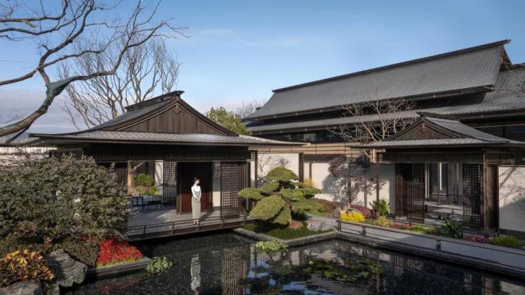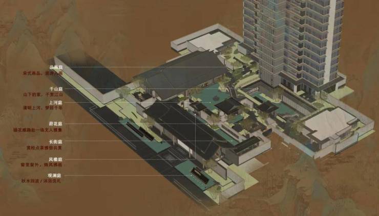 “庭院深深深几许,杨柳堆烟,帘幕无重数。”宋代庭院的普遍风尚为整体的景象简约而意境深远,擅于通过山水等借景的形式来营造景深的意境。整体庭院布局构造了“三进七庭”的雅居情境,一座隐桥悬于水面,将人们的生活串联起来,树影青葱,清风摇曳,为栖居增添一份趣味与诗意的体验。