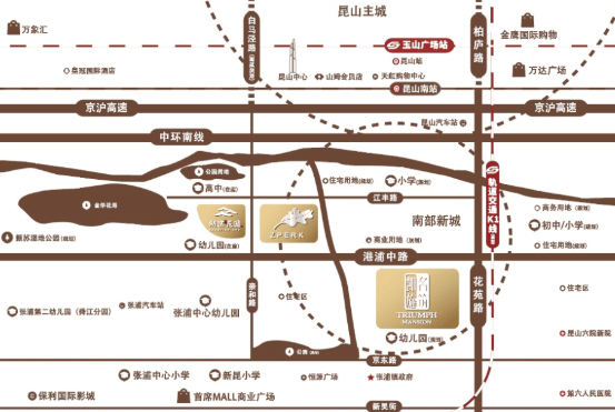 交通:紧邻中环南线、京沪高速、沪常高速,规划中的 K1 地铁线将接驳苏州轨交 11 号线,距昆山南站直线约 6.5 公里。