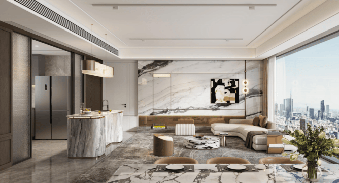 规模:占地约 5.23 万㎡,总建面约 14.99 万㎡;容积率1.7,绿化率约 30%;9 幢 14–17 层高层 + 12 幢 6 层类独栋叠墅,共 582 户,70 年住宅产权;