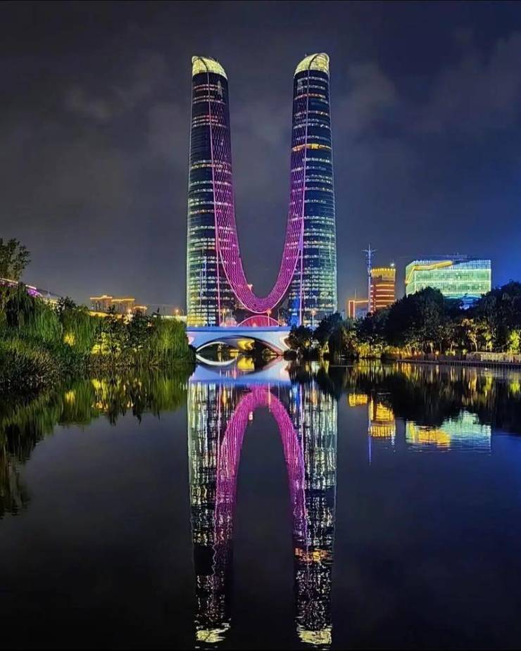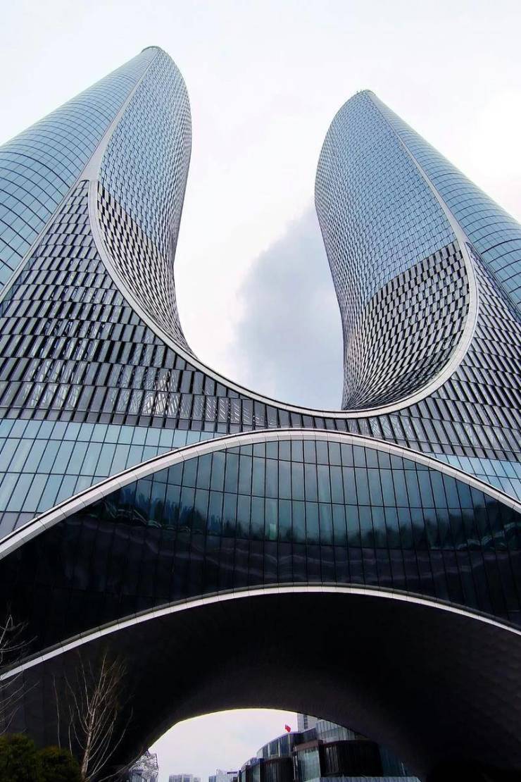 建筑设计:以杭州拼音首字母 “H” 为灵感,双塔以拱形连廊衔接,倒影形成 “江南园林拱门” 意象,幕墙采用近 25000 块不规则弧面玻璃,荣获 2024 年 CTBUH 全球高层建筑奖。